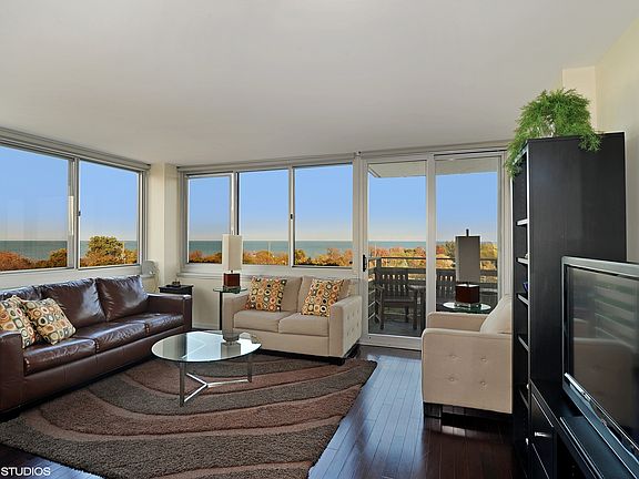 Unbelievable south, east and north views of the lakefront and downtown Chicago from this beautifully rehabbed 2 BR, 2BTH unit with gorgeous finishes, tons of light and a 20 ft private balcony overlooking the lake! Balcony is off of the living room and the master suite as well with incredible views of Downtown Chicago, the park & the lake. Awesome location in the historic Bryn Mawr District of Edgewater... right next to the park, beach & lakefront bike path and close to the Red Line "L," express bus to downtown and all of the wonderful shops and restaurants in Andersonville & Edgewater. All this in an iconic and well cared for modern mid-century high-rise. Monthly assessment includes heat, air, cable & internet and the apartment features a highly upgraded kitchen, beautiful hardwood floors, spacious living space, separate dining room area, dry bar with beverage fridge and an incredible master suite with south east views of the lake and balcony access. Tons of closet space throughout and a garage parking space available with the unit (asking price for parking is $21,900). This home has all the bells and whistles and is the most desired tier in the building. This home is vacant at the moment so we are able to do showings.