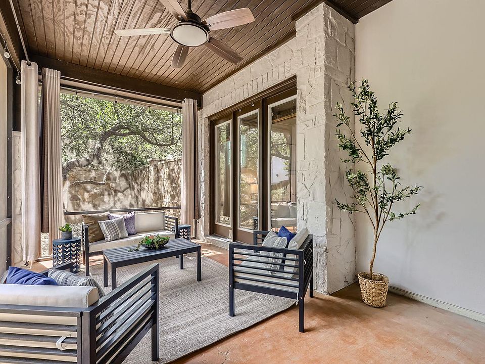 Rare Find in Canyonside at Falconhead West! Immaculate 3-bed, 2-bath freestanding end unit condo with soaring ceilings, white oak floors, and a fully renovated kitchen + spa-like primary suite. Enjoy a screened-in porch with greenbelt access, walk-in closets, and plantation shutters. HOA covers yard + irrigation for true lock-and-leave living. Steps to the pool/clubhouse, minutes to Hill Country Galleria & Lake Travis ISD. Move-in ready perfection in Bee Cave!