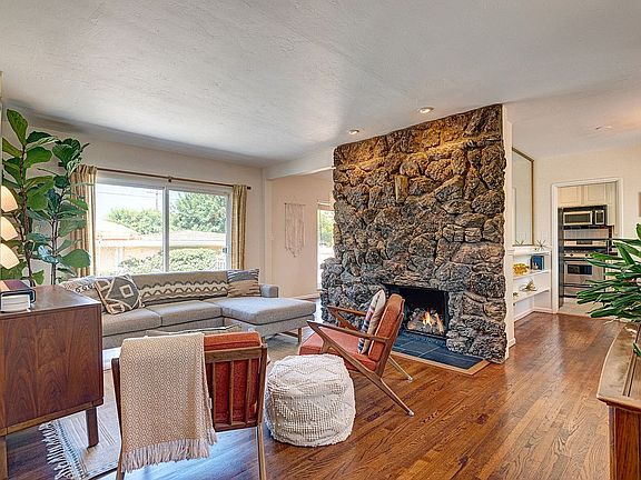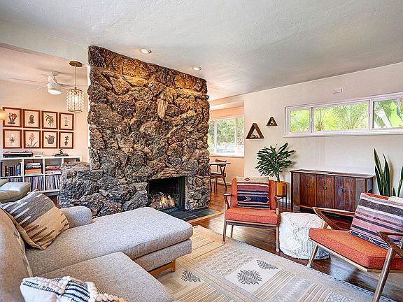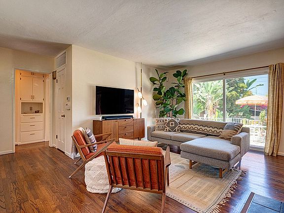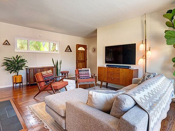 Step into this gorgeous two bedroom plus den Mid-Century style home on a generous corner lot with a Palm Springs vibe. Where analog meets digital, this property is thoroughly modernized with impressive vintage design. From the original oak flooring to the upgraded soundproof windows that provide abundant natural light; the jewel of this charming home - a large, retro lava rock fireplace. The kitchen features ample storage and complements the newly remodeled bathroom that includes subway tile and a crisp, clean ambience. Open double slider doors to the large terraced backyard area complete with Jacuzzi, desert-style sand seating around a firepit and a lower private, fenced yard with mature foliage. The home also includes a detached two car garage and gated parking area for a total of six cars, or room for an RV! This house dazzles with culture, style, and comfort as will its next lucky owner!