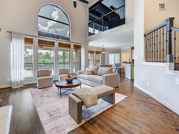 Nestled in a peaceful cul-de-sac within the prestigious gated community of Lakes on Eldridge North, this stunning 5-bedroom home offers luxury living both inside and out. The backyard is a true retreat, featuring a private heated pool with optional child/pet fence, covered patio, and outdoor basketball court. Perfect for entertaining or relaxing year-round. Inside, the open-concept floor plan boasts a spacious living area with built-in shelving and a cozy gas fireplace, seamlessly flowing into a well-appointed kitchen. The first-floor primary suite offers a spa-like ensuite bathroom, and a generous walk-in closet. Upstairs, you'll find four additional bedrooms, a large game room, and a convenient study nook ideal for work or play. Additional highlights include plantation shutters throughout, an indoor golf simulator, and a 3-car tandem epoxy garage. LOEN residents enjoy access to top-tier amenities including lakes, walking trails, pools, tennis courts, and more.