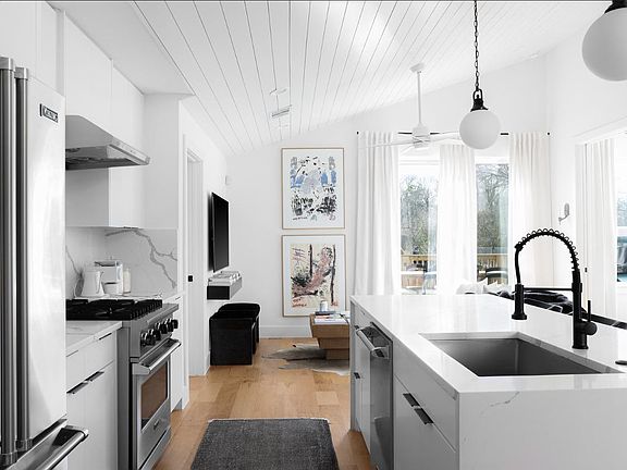 This home comes equipped with efficient central air, heating, washer and dryer, hardwood floors throughout, shiplap ceiling in main living area, Viking appliances, a large deck, private driveway, and attached carport.