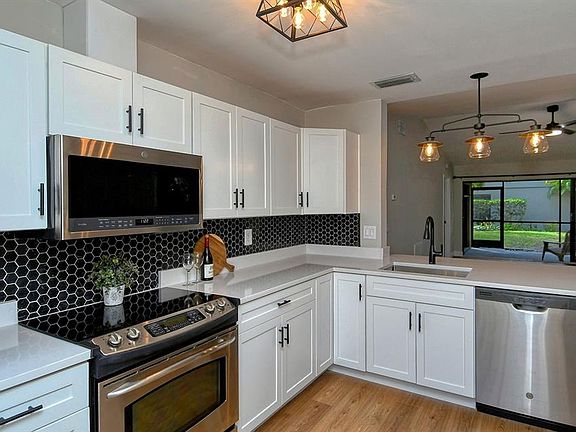 Beautiful First-Floor End Unit condo with Gourmet Kitchen in Summerside Community. This stunning first-floor end unit, nestled in the picturesque Summerside community, boasts a completely renovated interior with modern upgrades throughout. The highlight of this home is its new gourmet kitchen, perfect for culinary enthusiasts and entertaining guests. The master suite showcases new double vanity and lovely tiled shower. Step outside onto the spacious patio and enjoy your morning coffee surrounded by the tranquility of several large shade trees. For outdoor enthusiasts, you'll love the convenience of biking to Siesta Key Beach just minutes away. This property also features a covered parking spot just steps from your front door, ensuring convenience and protection from the elements. Take advantage of nearby restaurants and shopping destinations for all your dining and retail needs. First and last month's rent plus one month of rent used as a refundable security deposit. Don't miss out on this amazing opportunity!