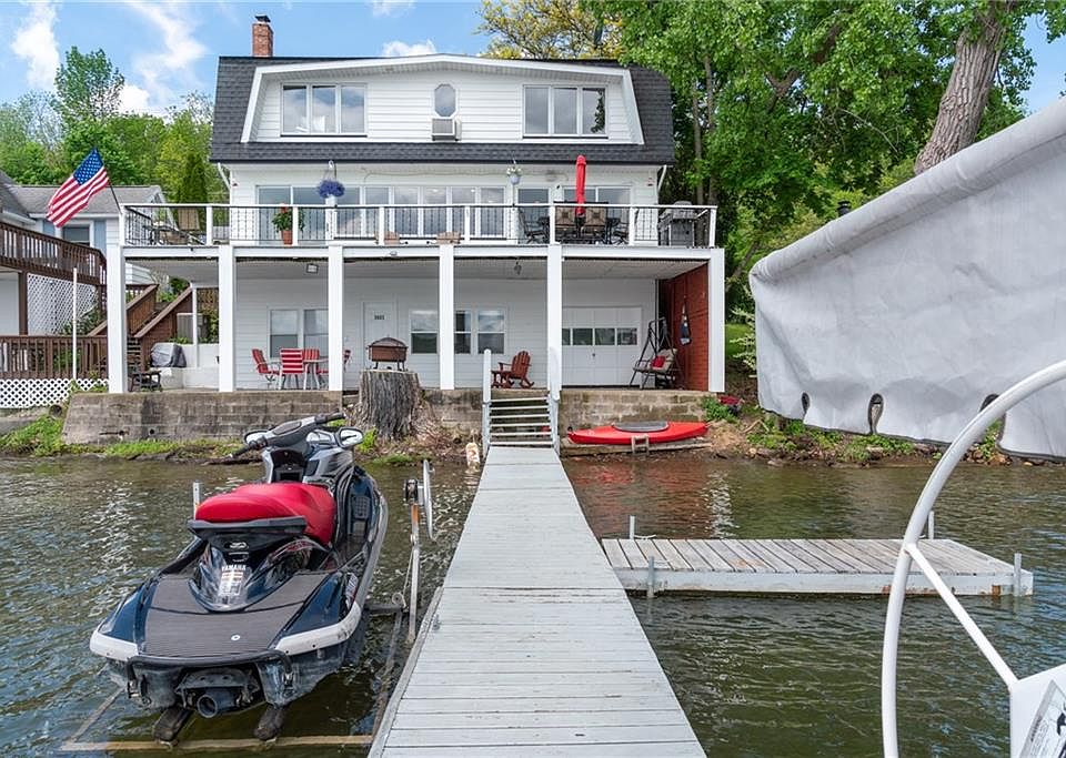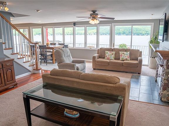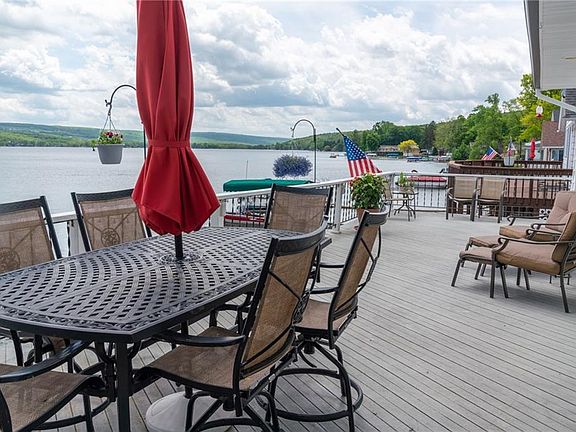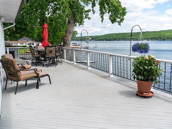 Wall of windows in kitchen, dining room and living room with fabulous views of Conesus Lake leads to balcony deck full width of lot! Gourmet cooks delight in this amazing kitchen-granite counter tops, wet bar, snack bar, double oven & generous prep space! 2nd floor living/family room can be easy 4th bedroom with lake views as well. Master suite , great walk in closet-lake side to enjoy the views.Additional lower level garage for storage. 2 car tandem garage-great parking. Fabulous storage throughout home. Easy, low maintenance living