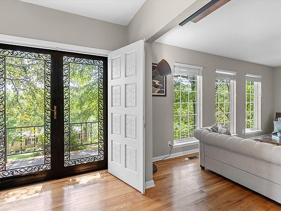 Upon entering, you'll find a separate dining room with tall windows that flood the space with natural light and offer picturesque views. The modern kitchen is bright and inviting, featuring a breakfast nook with French doors that open to a soothing back deck. This deck, surrounded by nature, is ideal for outdoor living and entertaining with family and friends.
