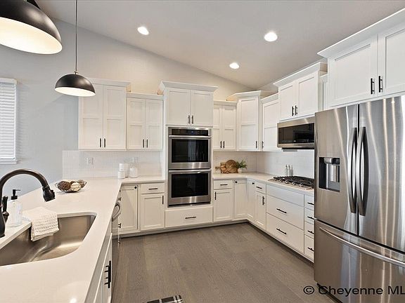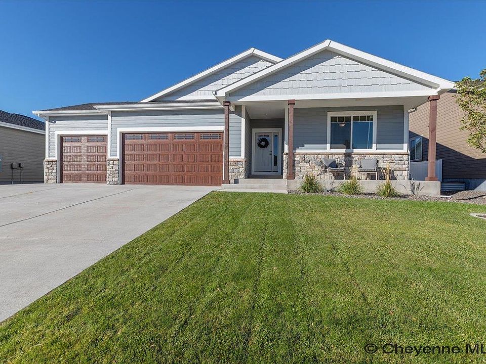 Welcome to your dream home in Whitney Ranch, Cheyenne’s premier master-planned community with parks, trails, and open space! This immaculate 5-bedroom, 3-bath ranch-style home offers nearly 4000 total sq ft and the best price per square foot in the neighborhood. Featuring an oversized 3-car finished garage and brand new fully finished basement. With a wrap around backyard, this home backs up to open space, walking paths and includes a south-facing driveway for easy winter care. Step inside to a light-filled open floor plan with engineered hardwood flooring, gas fireplace, a gourmet kitchen with double ovens, a gas cooktop, quartz countertops, pantry, stainless steel appliances, and a large serving bar. Washer and dryer are included for your convenience. The main level boasts nearly 2000 sq ft, including a spacious primary suite with a sitting area, jetted tub, oversized walk-in closet, and dual vanities. Two more bedrooms and a second full bath complete the main level. The brand new fully finished basement is perfect for entertaining, relaxing, or fitness. With plenty of room for a workout area, pool table, and entertainment area this basement truly offers endless opportunities for the whole family. The living room also features a custom tiled serving bar with butcher block countertop and a built-in dual-zone beverage refrigerator. A cozy modern fireplace, shiplap accents, two more large bedrooms, a walk-in closet, two storage closets, and a stylish full bath with a fully tiled shower and floor add to the appeal. Located in the sought-after Whitney Ranch Subdivision, you’ll love the neighborhood’s walking trails, green spaces, and playgrounds. Enjoy quality craftsmanship, thoughtful design, and unbeatable value, all in a move-in ready home. Realtor-owned.