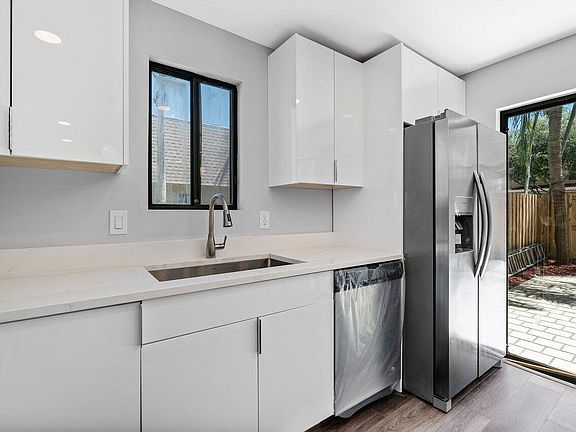 GUTTED! New roof, new a/c, new ceilings, new floors, new designer kitchen, new fixtures, new electrical panel, new plumbing where needed, new paint, new appliances, new flooring, new high hats and everything else you can think of! All work completed by a general contractor with permitting. 2 bedrooms and 2 bathrooms upstairs and 1/2 bath downstairs with full size washer/dryer. Private courtyard. Quadplex is on a lake. Neighborhood has pool and great walking areas. Central Palm Beach County location. You will not need to do a thing to this home for a long, long time!