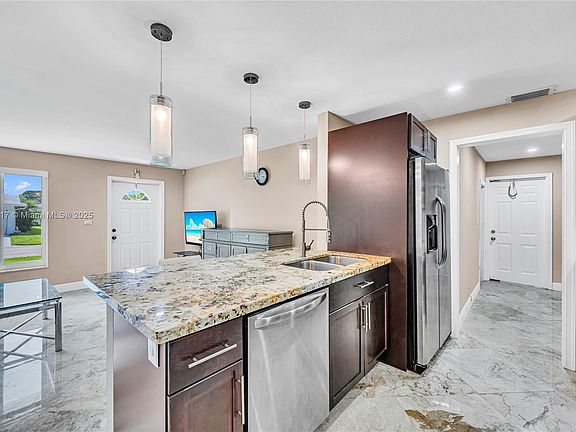 Beautifully remodeled 2-bedroom, 2-bath home with 1-car garage located in the desirable Mainlands of Tamarac Lakes. This move-in ready home features elegant marble flooring throughout, a spacious open-concept kitchen with granite countertops, stainless steel appliances, and recessed lighting. Both bathrooms have been tastefully updated with marble finishes, shower panels, and Bluetooth fan lighting. Impact windows, doors, and sliders provide peace of mind. Additional highlights include a large interior laundry/utility room, freshly painted interior, and a generous screened-in porch overlooking the landscaped yard—perfect for relaxing or entertaining. The community offers a clubhouse, pool, and sprinkler/irrigation services included in the HOA.