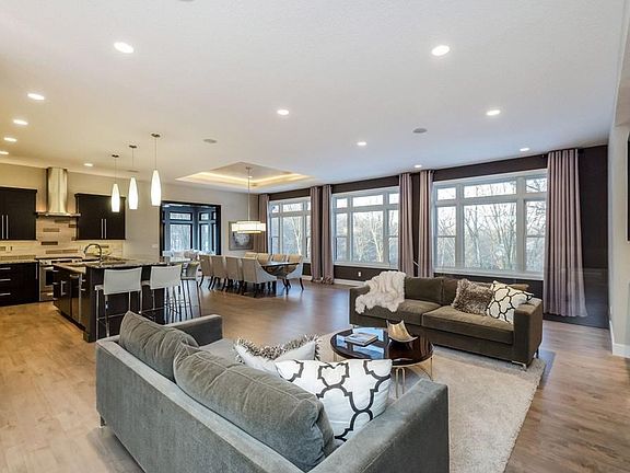 Love the 4 seasons? This stunning ranch home has a dream yard for summer. Imagine hosting parties in the new in-ground pool or grilling in the outdoor kitchen. Fall means cozying up to the gas firepit while enjoying the beautiful leaves in the wooded almost acre lot. Winter is a perfect time to curl up in the theater room, by one of the two gas fireplaces, or invite friends over to your bar complete with wine fridge located in the walk out basement. Enjoy the beautiful landscaping in spring from the soaring windows. The open design kitchen is a chef's dream with a huge island and walk in pantry. The spacious master suite has a relaxing bathroom with a walk in shower featuring dual shower heads. Main floor laundry room, newly stained wood floors and new carpet throughout. Over 1,800 sq ft of garage space with 3 heated stalls on the main level and 2 stalls accessed from the back.