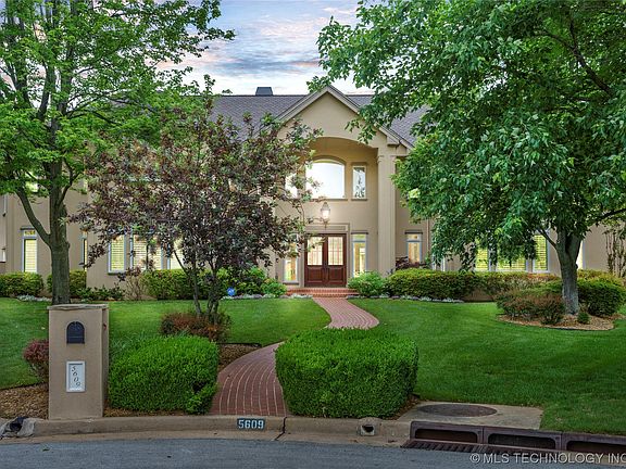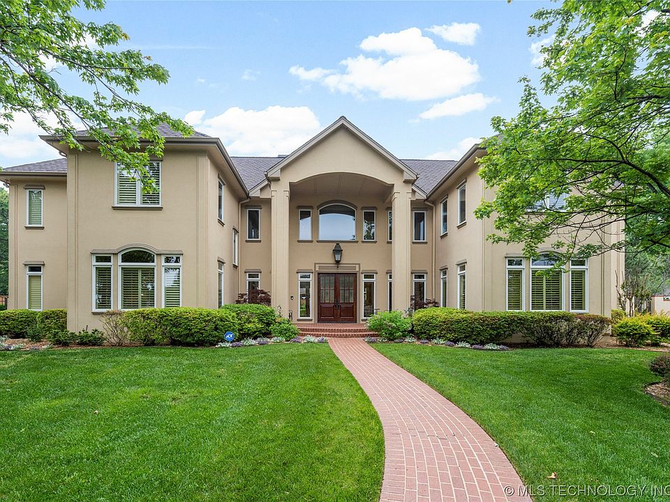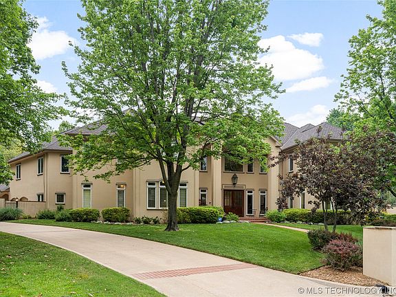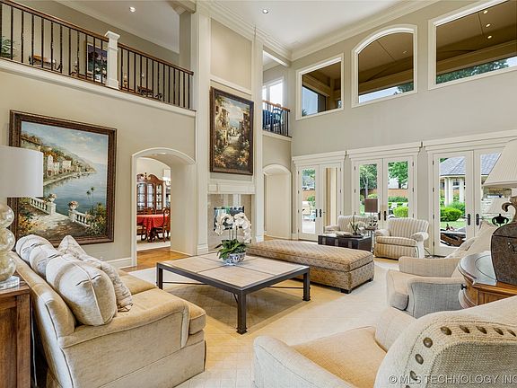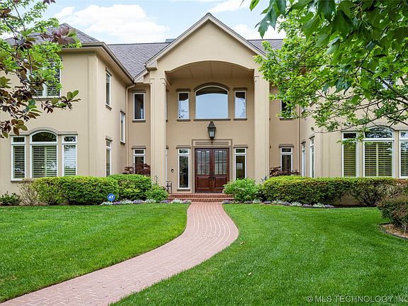 Welcoming South Tulsa Estate. Situtated on a beautifully landscaped 3/4 acre, this home has walls of windows throughout making for a bright and cheerful home. The primary wing on main floor has an office and a suite with a sitting area, exercise room and a spacious bathroom with dual closets. A secondary bed, a bath, formal dining and a bright kitchen with a cozy family space complete the downstairs. Dual staircases serve the upstairs with three bedrooms, a massive game room with wet bar and a huge media room await entertaining. Outside you'll find a poolside cabana with kitchen and wood burning fireplace and a remotely screened patio ready for summer days. A gated driveway serves the 4 car garage and beyond. Owner financing available.