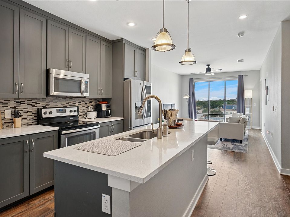 Sleek linesPrivate balconyFloor to ceiling windowsFenced dog runFlooded with natural lightViews at sunset