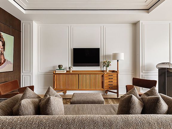 The open-plan layout is designed for both lavish entertaining and serene everyday living. The chef’s kitchen is anchored by a cascading island in Grigio Collemendina marble and is outfitted with a Pitt cooktop, Gaggenau refrigerator, dual Miele dishwashers, and dual Wolf ovens. For flexibility, the entire kitchen can be concealed behind custom bifold doors and oak enclosures, transforming seamlessly from culinary workspace to elegant entertaining backdrop. Adjacent, the media room creates a comfortable, connected environment, while a corner dining area with classic SoHo views accommodates ten with ease.