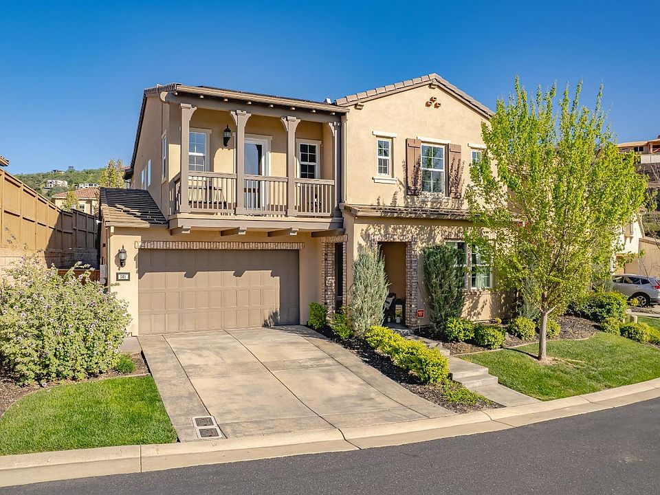 Welcome to 561 Chateau Drive in the Villagio community at The Promontory. This elegant single-family detached home offers 2,683 ft of luxury on a 5,227 ft lot. Upon entering, you're welcomed by a covered patio leading to a foyer with abundant natural light & an elegantly angled staircase, hinting at the architectural finesse throughout. The main level includes a convenient bedroom & bathroom, ideal for guests or an office. The home centers around a spacious great room that merges a family room, dining nook & a kitchen equipped for a chef, with wood-looking tile floors, a large island, granite countertops & stainless steel appliances. Adjacent is a drop zone leading to a 2-car garage & a large pantry. Outdoor living is highlighted by a California room offering pool views, a gas firepit & a patio, perfect for relaxing or entertaining. Extra outdoor space is available for storage & gardening. Upstairs features two bedrooms, a bathroom, laundry, a loft & a master suite with a built-in dresser, a luxurious bathroom with dual sinks & a large walk-in closet. One bedroom has a balcony overlooking the front. Enhanced with solar panels for energy efficiency, this home is near Folsom Lake & Promontory Park, making it a prime spot in El Dorado Hills for luxury living.