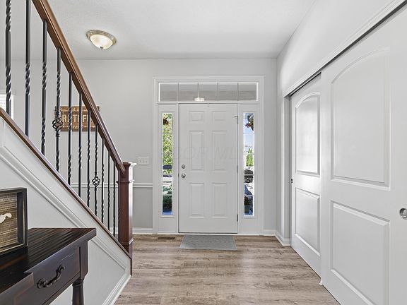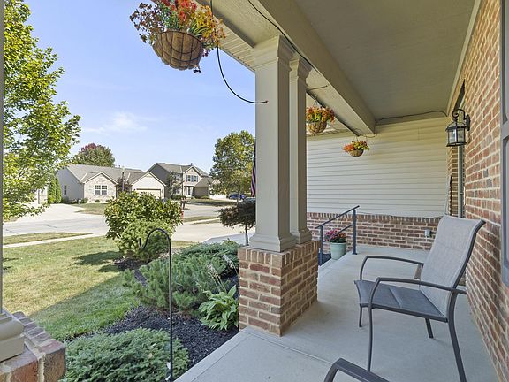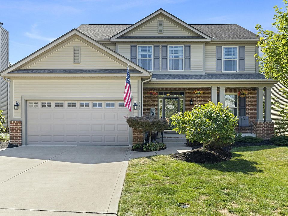 Beautiful Two Story home located conveniently within walking distance to Big Walnut elementary and intermediate schools. Inviting front porch. 4' bump out in great room and owner's suite. Great room with 9' ceilings, loads of natural sunlight, newer carpet in 2022, and gas log fireplace. Large kitchen with new floors in August of 2025, granite counters, stainless steel appliances, center island, and eat-in area with sliding glass door to large patio and landscaped back yard. Four spacious bedrooms with new carpet in August 2025. Large owner's suite with loads of natural sun light, owner's bath with large window above garden tub, ceramic tile shower with bench, large walk-in closet. Lots of upgrades to this home including: Elfa Closet organizers throughout. Garage side extension for extra storage. Concrete driveway bump out accommodating 3 cars wide, custom walkway to front porch. Custom landscaping and trees.