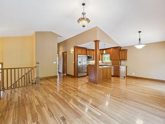 This stunning multilevel custom finished home on a wooded lot is located across from Snail Lake Regional Park trails and 3 blocks from Snail Lake beach. A highlight of the property is the amazing garage, featuring space for two cars which expands into a versatile multi-purpose area, with three skylights, it's perfect for a workshop, a sport court, or storage for boats or additional vehicles. The finished garage has heating/cooling, and an epoxy floor.The upper level has vaulted ceilings and teak wood floors. An open floor plan seamlessly connects the living, dining, and kitchen areas.The kitchen is a chef's delight, with Cherry custom cabinetry, Cambria countertops, and stainless steel appliances