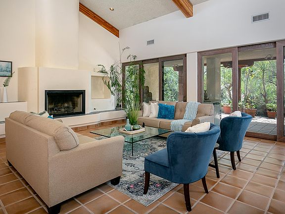 ANOTHER HUGE PRICE REDUCTION! Spectacular Southwest-inspired custom home situated in Gold Hills. Built in 1994, the exterior features curved walls, blue tile accents, desert landscaping & a red tile roof. Enter through the rustic wood doors into a large foyer that showcases the Saltillo tile flooring. The massive living room has a fireplace with raised hearth for seating, niches, cathedral ceiling with large wood beams, wall of sliders to the rear patio, track & recessed lighting, and opens to a formal dining room with custom chandelier & built-in buffet & lighted china cabinet. The gourmet kitchen has a 6-burner Thermador Professional range, Sub-Zero fridge, two Miele dishwashers, cherry cabinetry, granite countertops & backsplash, butlerâs pantry, 3 stainless sinks & a breakfast area with ceiling fan, built-in desk & sliders to the rear patio. The expansive master retreat has cathedral ceiling with wood beams, fireplace, reliquary niches, built-in desk, curved walls, track lighting, 2 walk-in closets & has an XL master bath with huge walk-in shower, vanity, 2 sinks, ceramic tile & a wall of mirrors. The 3 other bedrooms all have private patios & share a hall bath. The guest ¾ bath features a shower, ceramic tile counter, copper sink & fixtures & decorator paint. Out back is a large covered patio with ceiling fans, heaters, misting system, fountain & built-in BBQ & fridge. Other amenities include 2-car att garage, separate laundry, garden, security system, and C/A & heat.