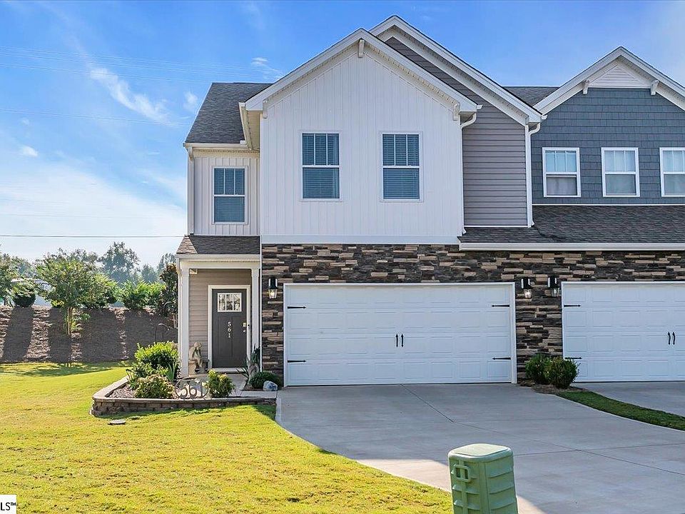This is a Linville A floor plan. D R Horton's most popular that's built on a choice lot, end unit with open common area to it's left side. Great for a pet. It provides an open living area with one bedroom and one bath on the main floor. Upstairs is the owner's suite and two extra bedrooms and two baths. The laundry and second living room are also on this upstairs level. LVP is an upgrade both upstairs and down. 9' ceilings on the main floor, drop-zone area off the two-car garage entrance and a walk in pantry. The kitchen has white cabinets and St. Cecilia granite counter tops throughout. The appliances were upgraded to a stainless Kitchen Aid refrigerator and LG glass top stove with double ovens. All appliances included. Sudduth Farms amenities include pickle ball courts, beach style volley ball, a Jr. Olympic pool, covered outdoor entertaining area with a fireplace and green space. It's a short distance to Woodland Elementary, Riverside schools and the Lowes Foods shopping center, I-85 and the GSP Airport.