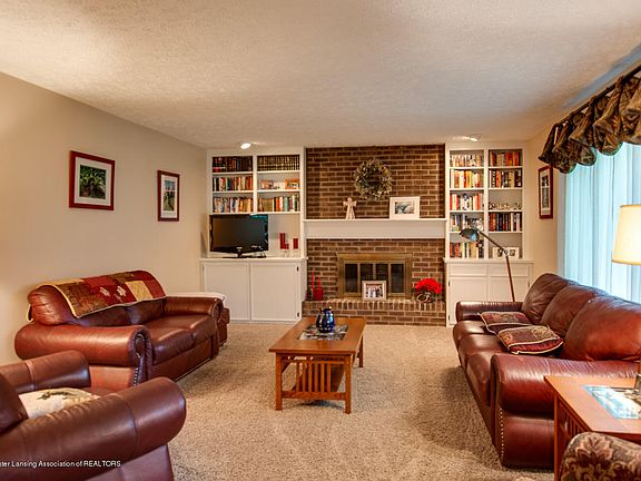 The living room with lighting above the crown molding is currently being used as a dining room. Remodeled kitchen with newer cabinets, granite counter tops, center island, tile back splash with accents, and appliances (brushed metal refrigerator & dishwasher). Hickory (3/4") flooring in foyer, kitchen and dining area. The first floor 1/2 bath has been updated with faucet, quartz counter top & contemporary cabinet. Spacious family room with wood burning fireplace with brick hearth and built-in cupboards and shelving. Large master BR with walk-in closet & updated private bath (marble tile floor & shower). Two additional bedrooms and bath on the 2nd floor (bath has all been updated except the bathtub). Fabulous lower level with a 2nd family room, a large bedroom with egress window, laundry room, office with built-in desk, cabinet and cupboards, and a third full bath with newer shower door, cabinet, counter top, sink and light. The lower level ceiling height is just under 7 feet. Res: items