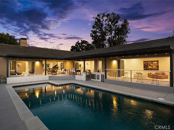The residence features a carefully curated floor plan centered around a grand entertainment pavilion, which overlooks a sparkling saltwater pool. The impressive bi-fold glass walls that wrap around the rear of this L-shaped home create an effortless transition between indoor and outdoor spaces. Inside, the formal living and dining areas make a striking statement with their soaring 17-foot ceilings and an oversized wood-burning fireplace, providing a dramatic focal point for gatherings. The heart of the home is the modern kitchen and family room, designed for both style and function. It includes a vast center island, professional-grade Thermador appliances, a sleek flush-mount hood, a walk-in pantry, and pristine white quartz countertops. Adjacent to the kitchen, the game room, poolside bar, and wet bathroom offer a sophisticated twist on casual entertaining, reminiscent of a chic pool house. The primary suite, located in the eastern wing, provides a serene retreat with expansive pool views, a generous closet, dual vanity areas, a separate chamber room, and a stunning glass mosaic-tiled shower. Four additional bedrooms are thoughtfully positioned in the western wing, ensuring privacy and comfort. This estate-sized lot spans over 10,000 square feet and is quietly nestled on a prime interior tract in Park Estates. This home features an array of smart home technologies, including Lutron lighting and HVAC automation, a wired sound system, Wi-Fi extenders with Cat5 wiring, and Pentair pool automation. Additional updates include an outdoor kitchen with a Lion grill, state-of-the-art pool equipment, a durable concrete tile roof, Milgard windows, updated electrical and plumbing systems, water softening system, a tankless water heater with a recirculating pump, modern insulation, and dual-zone HVAC systems. This exceptional property, with its unparalleled design and modern amenities, offers a rare opportunity to own a piece of architectural excellence in Park Estates.