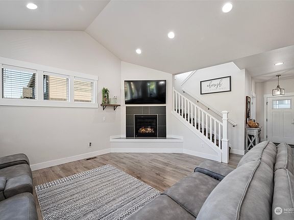 Fantastic floor plan in an excellent location! Walk into this bright and open concept home with bountiful amounts of natural light. Living room and kitchen transition perfectly and lead to covered outdoor patio backing up to green space that expands the privacy and open feel of the property. The kitchen features quartz counters, upgraded appliances, and a bar counter ideal for entertaining. Relax next to the gas fireplace in the living room boasting view windows & vaulted ceilings. Primary bedroom on main level including large walk-in closet, beautifully tiled shower, large tub and double-vanity. The large 4th bedroom on main floor functions as a perfect home office. Home has been impeccably kept and showcases high-end finishes throughout!