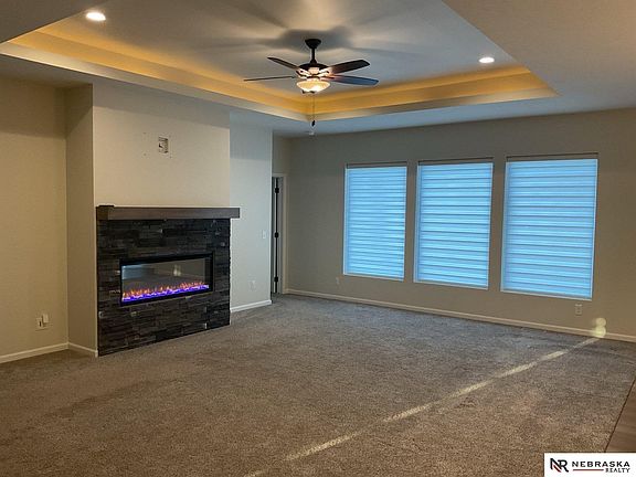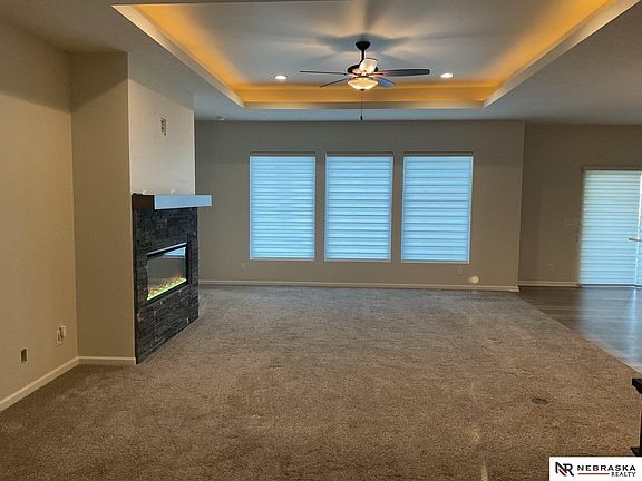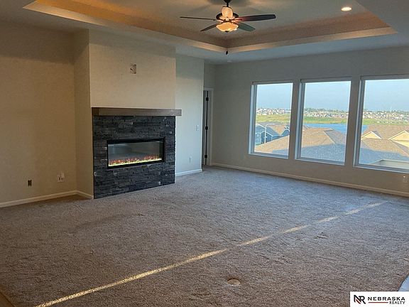 This charming ranch home in the sought-after Elkhorn School District offers breathtaking Lake Flanagan views from a covered deck. It features custom upgrades throughout, including an RO water purification system, water softener, and custom blinds. The home includes 2 bedrooms, 2 bathrooms, and a den used as an office on the main level, with a spacious 1,823 square feet. The full basement awaits your personalized touch, and a 2-car garage completes this elegant and modern almost home. AMA