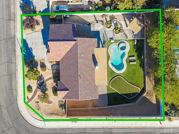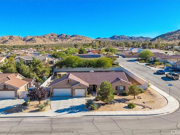 Welcome to 56135 Nez Perce, a stunning turn-key POOL home located in the highly desirable Mesquite neighborhood of Yucca Valley. This beautifully maintained 3 bedroom, 2 bath property is nicely situated on a large corner lot and features 1,764 square feet of living space. As you step inside the bright & airy great room you'll find 10-foot ceilings, earth-toned tile flooring, a lovely gas fireplace and large windows that let in an abundance of natural light. This home's modern style and open-concept layout is one to be desired. The living room flows effortlessly into the dining and kitchen area complete with recessed lighting, upgraded appliances, a center island with beautiful granite countertops and bar seating, ample cabinet & counter space and a walk-in pantry. All bedrooms have carpeted floors & ceiling fans, and the primary bedroom adorns french doors and a sliding glass door that leads to the back patio. The ensuite bathroom is sure to impress with a dual sink vanity, jetted tub, walk-in shower and huge walk-in closet. There is also a convenient indoor laundry room just off the kitchen with a utility sink and additional cabinetry for storage. That's just the inside! The backyard is truly an entertainer's paradise. From the awe-inspiring in-ground pool and spa to the turf putting green, large covered patio with ceiling fans, stucco pergola, Vinyl privacy fencing and ample space for BBQs and get togethers, it's like having a little resort right outside your back door. Not to mention the oversized 3 car garage, low HOA and close proximity to town, schools, shopping, eateries & more! Come take a look & let this homes charming allure do the rest, your new desert home or weekend retreat awaits!