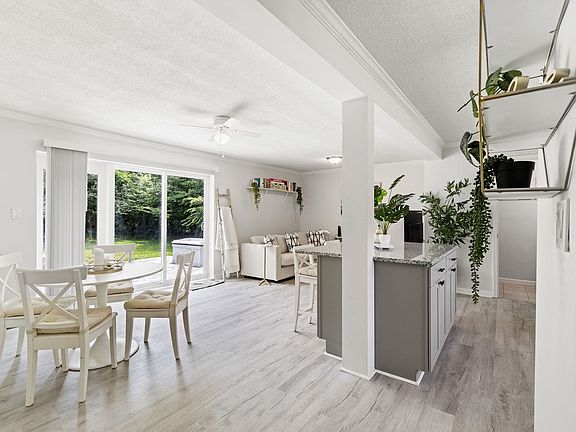 Inside, the residence boasts an open-concept kitchen and living area designed for both functionality and style. Recent upgrades include brand-new flooring throughout, new kitchen countertops, a new stove, and a fully renovated bathroom. These enhancements combine to create a fresh, move-in ready home.