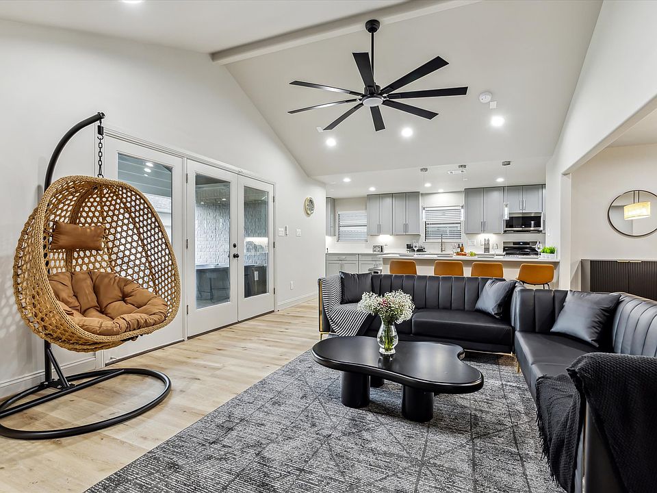 The open-concept living area is perfect for gathering with family and friends. The modern yet cozy decor, stylish furnishings, and warm touches create an inviting atmosphere.