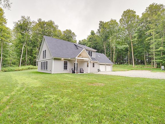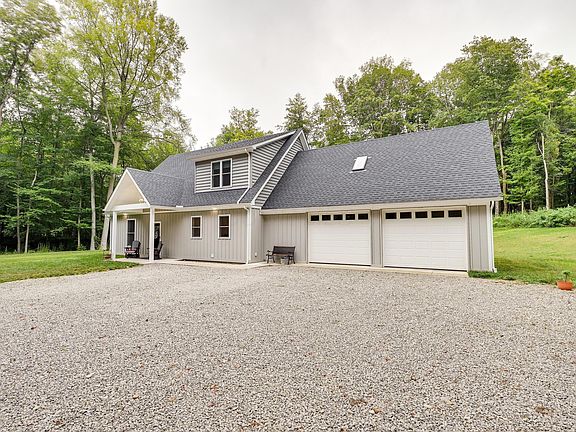 Tucked away at the end of a long private drive, this stunning home offers complete privacy on a fully wooded 5-acre lot. Inside, the great room impresses with soaring vaulted ceilings, exposed beams, and expansive windows that fill the space with natural light.