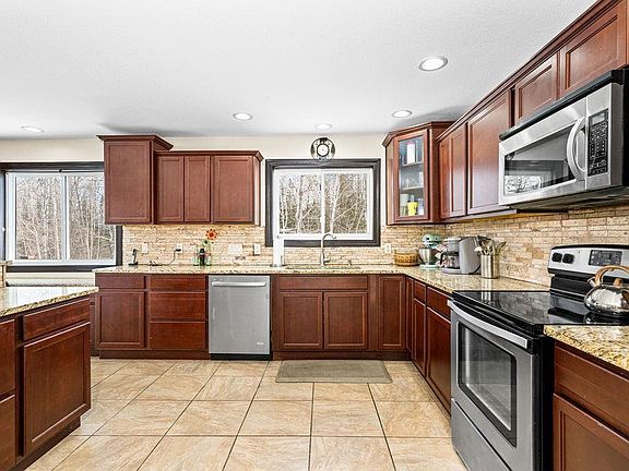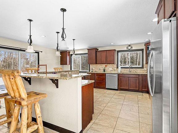 Discover the ideal blend of country serenity and town convenience with this lovely 5-bedroom, 2-bath home on 7.5 scenic acres. Step inside to a showstopping kitchen appointed with cherry cabinetry, granite countertops, an L-shaped bi-level island with generous seating, a built-in desk, and stainless-steel appliances (approximately 8 years old). The porcelain flooring carries seamlessly through the spacious dining area and sunny breakfast nook, leading to a bright living room where you can enjoy tranquil views of the backyard pond. The main floor offers two inviting bedrooms and a full bath for easy living, while downstairs, a cozy family room with a wood-burning fireplace and a versatile “great room” await. Currently used as a primary suite, the great room could effortlessly serve as a media room, playroom, or home office. You’ll also find two additional bedrooms on this lower level, plus a full bath with a relaxing jetted tub and a utility room offering plenty of storage. Enjoy the comfort of multiple mini-split units, a pellet stove for winter warmth, and organized closets throughout. A wheelchair-accessible ramp adds to the home’s overall convenience. Outside, dual wraparound decks overlook a yard complete with mature apple and plum trees and a pond—perfect for hockey or ice skating in the colder months. Tucked just steps away from the home is a large two-car garage. Embrace the ease of country living without sacrificing proximity to town in this bright, spacious retreat.