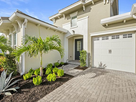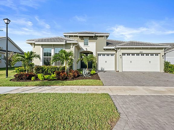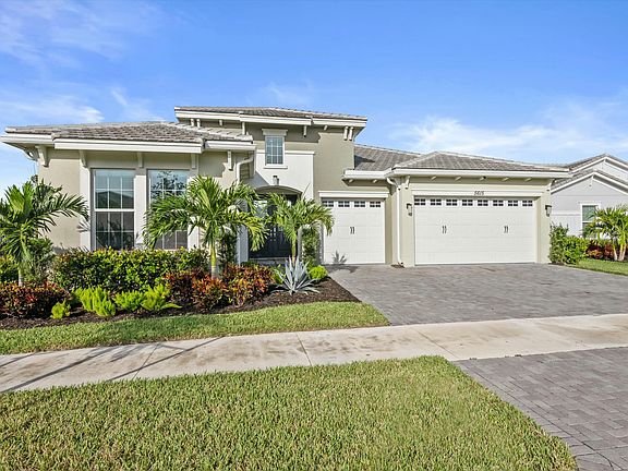 Welcome to this stunning Sanderling model nestled in the sought-after Orchards of Westlake! This exquisite 4-bedroom, 4-bath residence boasts an impressive 2,953 square feet of luxurious living space and a 3-car garage. From the moment you arrive, be captivated by the home's exceptional curb appeal, featuring clean, crisp landscaping and elegant navy blue French doors. Step inside to discover impact windows throughout, ensuring peace of mind and energy efficiency. Upon entering, you're welcomed by a grand foyer that leads to bright, clean white walls and rich dark brown laminate flooring flowing seamlessly throughout the main living areas and bedrooms. The open-concept design of the formal dining room, living room, breakfast area, and family room is enhanced by recessed lighting and abundant windows, offering breathtaking natural light and picturesque lake views. The modern touch of motorized blinds, that can be integrated with Alexa or Google, provides convenience and sophistication.