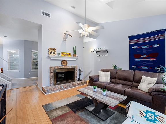 This home offers two spacious primary bedrooms, each with walk-in closets, perfect for flexible living arrangements, roommates, or guests. Enjoy added natural light from skylights, and enjoy the balcony for a bit of fresh air. A detached one-car garage, gated courtyard, and no exterior maintenance responsibilities make for effortless living. The community features two sparkling swimming pools, offering the perfect retreat on warm Texas days.