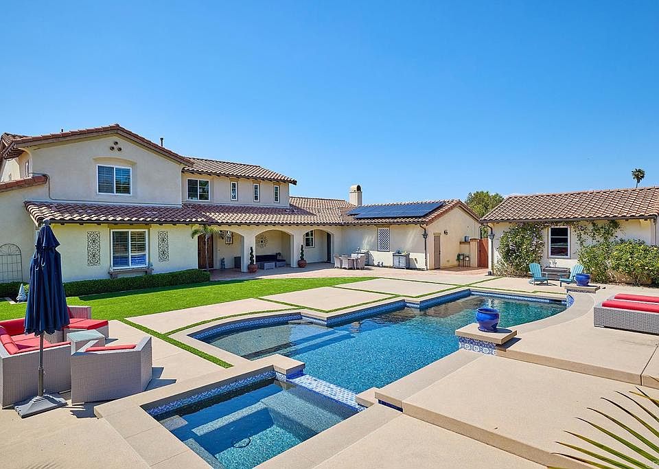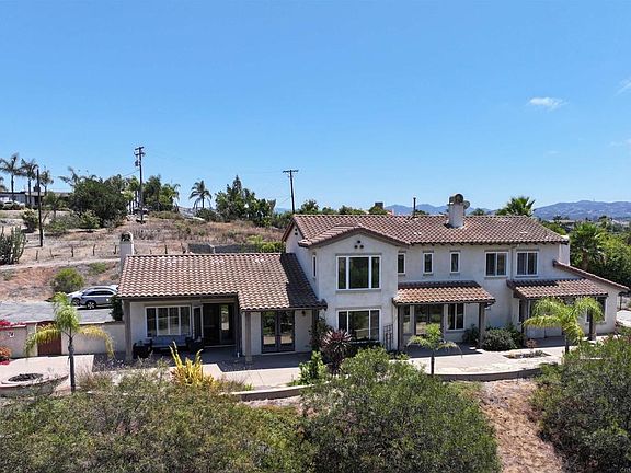 Tucked away in the rolling hills of Bonsall, this exceptional estate offers a rare blend of elegance, seclusion, and resort-style living. Privately set at the end of a quiet cul-de-sac, the 2.01-acre property captures panoramic vistas, coastal breezes, and an unparalleled sense of tranquility. Designed for both sophistication and comfort, the residence features 4 expansive bedrooms and 3.5 bathrooms. Soaring ceilings, abundant natural light, and three stately fireplaces create an inviting atmosphere throughout. The primary suite is a true sanctuary, complete with a spa-inspired ensuite showcasing a custom shower, jetted tub, and oversized walk-in closet. Entertain with ease in the gourmet kitchen, boasting a generous island, dual ovens, and seamless flow to outdoor living spaces—perfect for savoring iconic Bonsall sunsets. Multiple patios, a sparkling saltwater pebble tech pool with Baja shelf, spa, and soothing fountains invite relaxation and gatherings alike. Additional highlights include a versatile loft adjoining the fourth bedroom and full bath, dual-zoned HVAC, solar power, a 4-car garage, RV parking, and ample acreage with potential for a shop or ADU. With sunrise views from the front porch and golden sunsets from the back patio, this property delivers the essence of Southern California luxury—space, serenity, and a lifestyle defined by privacy and beauty.