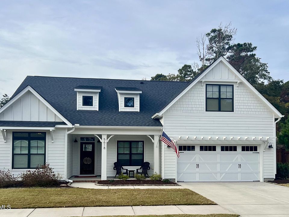 Welcome to your dream home located on a quiet cul-de-sac street in desirable Kaylies Cove! 4 bedrooms, 3 full baths. Custom built by Bill Clark Homes with upgrades galore. From your covered front porch, enter into an inviting foyer adorned with 4.5-foot wainscoting and crown molding. The open and airy living room has a brick-trimmed gas log fireplace surrounded by built-in cabinetry and exposed ceiling beams. The kitchen is a chef's delight featuring professional-grade appliances, a gas range with vent hood, quartz counters, and a large island with a porcelain farmhouse sink, reverse osmosis system, wall oven and microwave, soft-close cabinets and drawers, and under-cabinet lighting. The owner's suite does not disappoint, with a large closet, double vanity with quartz counters, a spacious walk-in tiled shower with a built-in bench, and a transom window bringing in natural light.