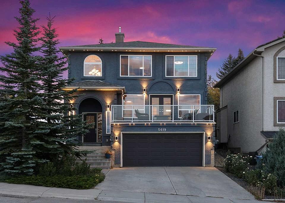 Tucked at the end of a cul-de-sac in Coach Hill, this beautifully maintained two-storey backs directly onto green space and serves up wide-open views of Calgary’s skyline. Inside, you’ll find over 3,100 square feet of thoughtfully designed living space—completely move-in ready and filled with natural light. The main floor is open and airy with oversized windows, a bright front living room with French doors opening directly to a large front balcony, where you’ll actually want to spend time—coffee, wine, and Stampede fireworks… all included. The kitchen blends warmth and function with solid wood cabinetry, built in pantry, granite countertops, stainless appliances, and a layout that connects easily to the breakfast nook, dining, and family room. Whether you’re hosting or unwinding, this space works. Upstairs, the primary suite takes advantage of the naturally private surroundings, and includes a large walk-in closet plus a relaxing 4pc ensuite with a deep soaker tub. Two more bedrooms, an upgraded 3 pc bathroom with a huge walk-in shower, and a sunny flex space, with views, give everyone room to spread out. The finished lower level checks all the boxes for hangouts, hobbies, or guest space—with a fireplace, full 4pc bathroom, storage, plenty of space to add a fourth bedroom if needed. Out back, the yard is private, fully landscaped with new sod and mature trees. The double garage is EV-ready, and there’s programmable Gemstone lighting on the exterior. Recent upgrades include a new roof, A/C, high-efficiency furnace, modern lighting, newer carpet, and full interior/exterior paint—almost everything’s been done for you. Just minutes to Westside Rec Centre, COP, schools, the LRT, downtown, and the mountains. Quiet, connected, and completely dialed in—this home is one of Coach Hill’s best values for commuters and regular mountain visitors