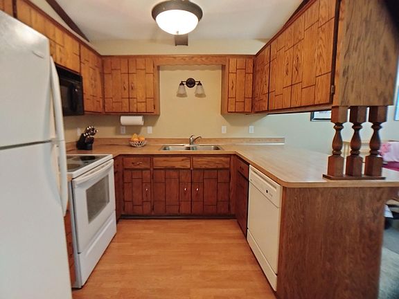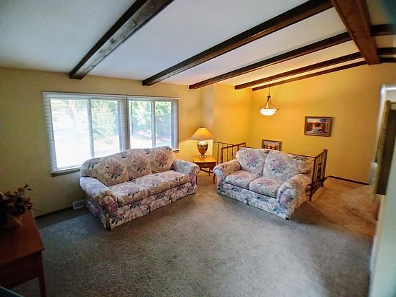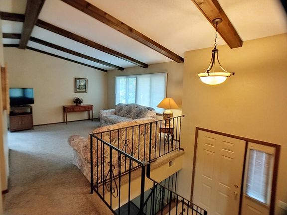several fruit trees. The large deck is sunny in the morning, and shaded in the afternoon, perfect for relaxing and getting sun or enjoying the shade. The home has vaulted ceilings upstairs and a wood burning brick fireplace down. The large master bedroom has a roomy walk-in closet, and there is a spacious pantry/storage room off the kitchen. This unit has a tuck under 2 car garage with shelving. Newer furnace, air conditioning & water heater as well as paint & carpet.
