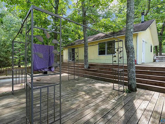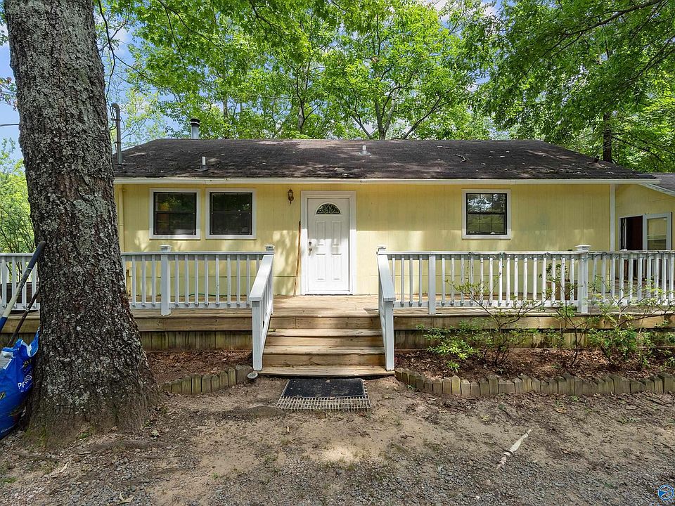 Nestled on 2 picturesque acres, this charming 2-bedroom, 1-bathroom home offers cozy living space and a generous 1600SF deck.The backyard, fully fenced and expansive, includes a metal shed and access to a serene, fish-filled pond. An attached shed with electricity adds convenience. A spacious 30’x39’ garage, an upstairs efficiency with a bathroom, kitchen, and two balconies. The bathroom awaits finishing touches, with materials on hand. The front yard blooms with Japanese cherry trees, peach trees, dogwood, cedar, and oak trees. Wild pink azaleas and yellow daylilies surround the pond,while the backyard is shaded by oak, cedar, dogwood,tulip tree,& thriving Chinese chestnut & pistachio tree.