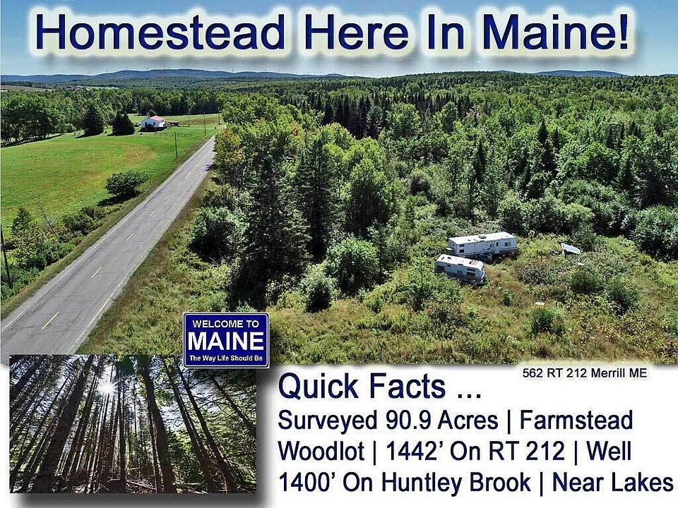 Crazy World And Looking For A Get Away From It All Maine Vacation Location? Thought Of Homesteading Or Building A Hunting/Fishing Camp Up In Maine? (Curtain Opens) Here's 90.9 Acres Of Northern Maine, Your Piece Of Aroostook County! Get 1442' On Scenic RT 212. Huntley Brook Crosses Land. Abandoned Pasture Farm Land On Front, Mixed Wooded Sections On Back. Rectangle Goes And Goes! Near Lakes, On All The Trails. Set Up Farmstead Or Vacation Investment For Relaxation Here At 562 RT 212, Merrill ME. Video. The Town Office In Merrill Shares The Overhead Cost By Joining Forces With Smyrna. Smart Town, Well Run Small Maine Communities Working Together. Go Organic, Everyone You Love Can Vacation Up In Maine. Develop The Maine Land, One Big Nearly 91 Acres With Wild Apple Trees, Wildlife, Space To Relax On Level To Rolling Land Up In Maine. Questions? Reach Out, Here To Help! Let's Connect!