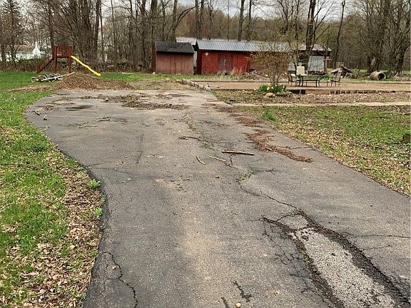 Acre lot in nice county setting just waiting for someone to come build their dream home. Black top driveway, Septic and Public water hookup. Framed up and ready for modular pad to be poured. Two sheds for storage