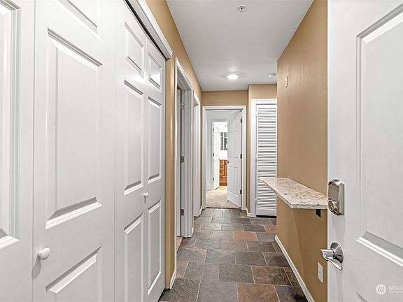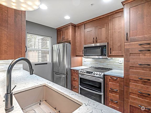 Perfectly situated west facing ground floor end unit showcases wall of windows overlooking private patio, spacious HOA-maintained yard & native growth protection surround. Home boasts elegant finishes, incl slab Quartz @ entry counter & kitchen counters over custom designed cabinets & sizable drawers. Luxury kitchen w mosaic tile backsplash, huge under-mount kitchen sink & new stainless-steel appl. All new— lighting fixtures, bathroom vanities, carpet, ceiling fans, baseboard heating & front load W/D. Tasteful neutral colors contrast w crisp white trim & doors. Beautiful tile entry w matching fireplace surround. Large primary bedroom w updated en-suit bath & closet. Designer guest bathroom w new scallop tile flooring. 1 car garage, #21.