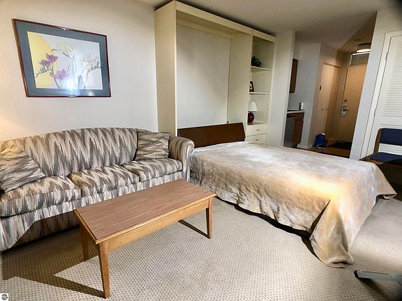 A waterfront condominium community, The Shores features 150 studio, one and two bedroom units in a natural wooded setting sharing 600 feet of sandy East Grand Traverse Bay shoreline. Each condo has a private deck with either water or woodland views. Enjoy summers at the Beach Club lounging at the pool and jacuzzi with nightly entertainment while generating rental income in the Resort Rental Program. 5620 is an upscale Shores Studio Condo within the Grand Traverse Resort but does not meet Resort Rental Program specifications. Prime Building 4 location with the shared sandy waterfront just steps from your door. Enjoy access to the shared sandy beach. Short term rentals are allowed. All measurements are approximate.