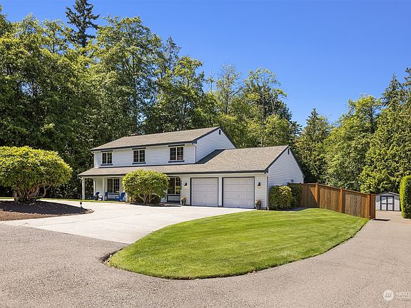 Resting on over half an acre, this turnkey 2-story offers a private setting with gorgeous, meticulously maintained grounds. Excellent curb appeal with circular drive, charming covered front porch, level lawn & beautifully landscaped garden beds. Enjoy summertime fun in the fully-fenced backyard with expansive lawn & a generous patio, perfect for outdoor entertaining. The convenient floor plan includes a spacious primary suite with updated 5-piece bath, main floor den, family room that opens to the kitchen & laundry on both floors. Ideal for boat/RV parking, a 2nd driveway extends from the road & through double gates to a 10x12 garden shed. Desirable location bordering Mukilteo, just minutes to the ferry & waterfront parks. Mukilteo Schools.