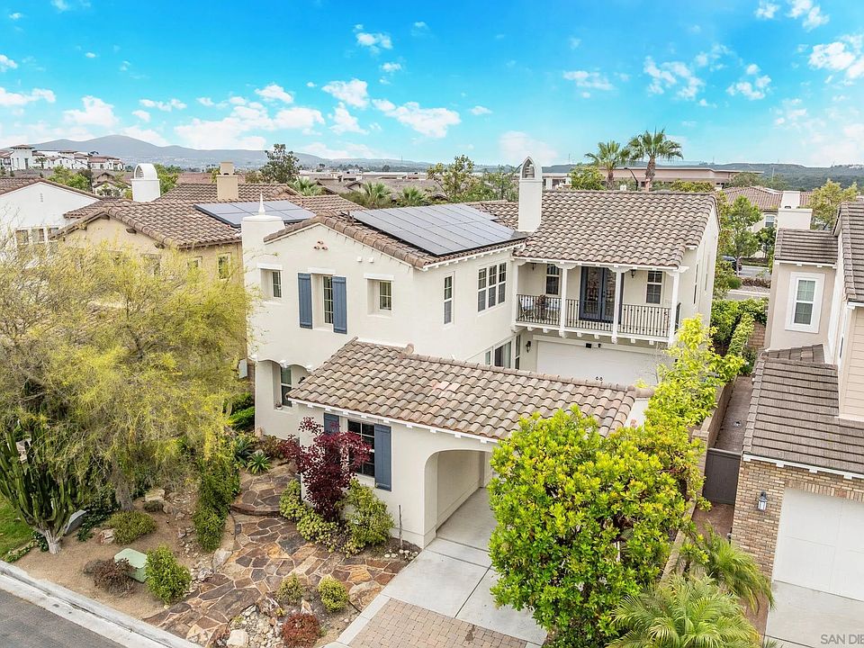 Situated on a rare, private street of just 47 homes with a single point of entry, this beautifully upgraded residence offers privacy and exclusivity while being part of the highly desirable Pacific Highlands Ranch community. Positioned away from the bustle of the main community yet just moments from it all, the home blends tranquility, convenience, and luxury in one exceptional offering. Upon entry, you’re greeted by new hardwood floors, leading into a fully remodeled chef’s kitchen featuring 2024 high-end appliances, sleek cabinetry, and elegant finishes. The functional layout includes a full downstairs bedroom and bathroom with a custom Murphy bed—ideal for guests or a stylish home office. The primary suite serves as a private sanctuary with a serene balcony, custom closets, and a spa-like bathroom complete with separate vanities, a large shower, and a deep soaking tub. Each bedroom includes custom built-in closet systems to maximize space & organization. Additional upgrades include 18 fully owned solar panels, a Tesla EV charger, designer blinds & a finished epoxy garage—perfect for a home gym or workshop, with a usable driveway for extra parking. The green yet low-maintenance landscaping offers year-round curb appeal and water efficiency. Located minutes from top-rated schools like Canyon Crest Academy & Pacific Trails Middle, or The Village at Pacific Highlands Ranch for boutique shopping and dining. Resort-style amenities include a lap pool, clubhouse, gym, playgrounds, trails, and more. With quick freeway access, commuting is effortless from this exceptional enclave.