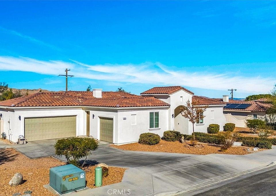 Welcome to this beautifully remodeled 3-bedroom, 3-bathroom home with a stunning COURTYARD located in the highly sought-after Mesquite Homeowners Association. This neighborhood is full of well-maintained homes and has curbs, sidewalks, and beautifully landscaped surroundings, which is rare for Yucca Valley. From the start, you'll notice the unique dual garages—one 2-car and one 1-car—both fully finished with upgraded lighting. Step through the front door into the large landscaped courtyard, featuring string lighting and a natural gas fireplace, perfect for year-round outdoor enjoyment. Inside, the home’s fully remodeled interior showcases luxury vinyl plank flooring throughout. The spacious living room opens to the large backyard and flows seamlessly into the impressive kitchen. This chef’s kitchen offers an abundance of counter space, storage, and a striking center island with waterfall-edge black quartz countertops, a black stainless steel sink, and barstool seating. Equipped with sleek, matching black stainless Samsung appliances, a pantry, and a separate bar area with a beverage refrigerator, this kitchen is designed for both style and functionality. A beautifully upgraded powder room with modern wood paneling, matching cabinetry, and countertops completes the main living area. The expansive primary bedroom includes a cozy alcove perfect for a seating area, office, or nursery, and also features direct access to the backyard. The ensuite primary bathroom is a spa-like retreat, with new cabinets, a freestanding soaking tub, a spacious walk-in tile shower, and a large walk-in closet. Down the hall, enjoy courtyard views as you move toward the two additional well-sized bedrooms, each with a walk-in closet and direct access to a shared Jack-and-Jill bathroom. This bathroom includes dual sinks, ample storage, and a shower-tub combo—ideal for comfort and convenience. The laundry room offers extensive storage, ample counter space, and a convenient utility sink. The backyard offers yet another patio space, perfect for enjoying the outdoors. Two large flat areas with artificial grass, plus a fire pit, create a versatile outdoor haven. The affordable monthly HOA fee of only $60 completes this home’s appeal. With every detail thoughtfully remodeled, this home is move-in ready and ideal for anyone seeking a modern, comfortable space where entertaining is effortless and the work has already been done.