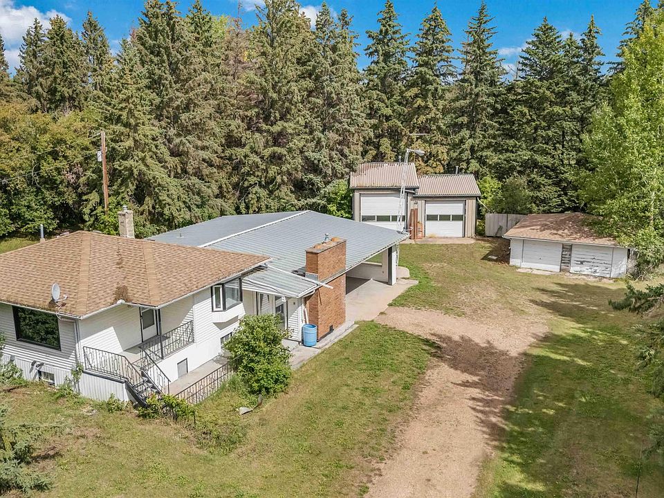 Dreaming of Acreage Living? Escape to this private, peaceful 2.99 acres, not in a subdivision, situated on level land, bordered by beautiful, mature trees. This property features a well-designed yard with a 1530 sqft Bungalow home that requires your TLC. The insulated and heated SHOP (Bay1: 34 x 15 & Bay2: 25 x 15) offers metal exterior & interior walls, cement floors, pit, 220 power and 2 shop doors, 10x14 & 10x10. In addition, the property presents a double, detached, oversized garage with a cement floor. This property is ideally located, making commuting easy...just 5km from Hwy 28. Only 10 minutes to Bon Accord, 20 minutes to the Edmonton Garrison, 25 minutes to St. Albert, 30 minutes to Edmonton's North end. Best of both worlds- close to city conveniences, yet private and quiet so that you can enjoy quiet, starry nights and nature, at its best!