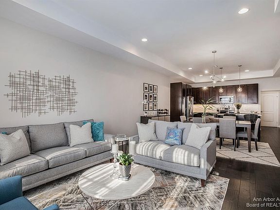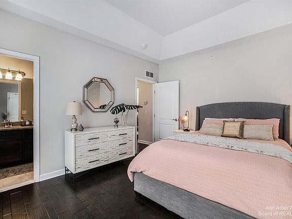 Stunning second-floor condo that overlooks the neighborhood green space. Located in the back of the development, every corner of the condo was carefully considered. The kitchen features 42'' cabinets with under lighting, glass subway tile backsplash, and granite counters. The large island is perfect for food prep and additional seating. All of the appliances are SS including the counter depth refrigerator. Hardwood floors, 10ft ceilings, window treatments, and designer lighting fixtures continue throughout the home. The substantial primary suite has a WIC, private bathroom with a tiled shower, euro door, and granite counter. Across the hall is the fabulous guest bedroom that has French doors leading to a balcony. The room also includes a bathroom with a tiled shower tub combo and WIC. Close proximity to restaurants, shopping, I-94, Chelsea and Dexter. Low township taxes and Ann Arbor Schools