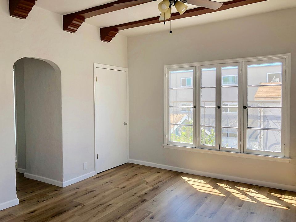Charming, upper level corner unit studio that has been fully remodeled! Lovely 1920's details still remain, like high ceilings with exposed beams, built in decorative shelving and over sized french windows. This studio comes with a HUGE closet that can work as an office, or bonus room, and an additional coat closet in the living room. The space is equipped with a wall AC and Heater, to ensure you stay comfortable all year round. The bathroom is clean and bright, with a new tub and shower. Kitchen is immaculate with a spacious eat - in area, plenty of cabinet space and stove plus refrigerator and microwave included. Laundry room on site. Cats are welcome, sorry no dogs. Please call or text to set up a viewing! Parking available for an additional fee. Tenant pays for their own electricity and gas. $50 utility charge for water and trash fees.