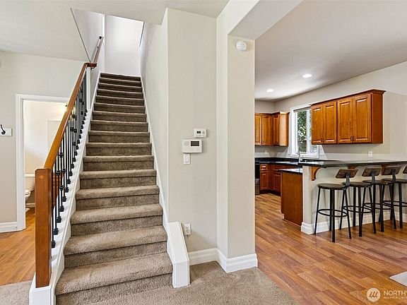 Tucked away in a quiet cul-de-sac, this beautiful University Place home backs to a serene, private greenbelt—offering peace, privacy, and natural views. Inside, you'll find a bright and open layout with soaring 9’ ceilings, elegant millwork, and durable laminate flooring. The wrought iron stair railing adds a touch of sophistication, while the upstairs landing creates a great bonus space. This thoughtfully designed home includes 3 bedrooms, 2.5 baths, and a spacious kitchen with slab granite countertops, rich shaker-style cabinets, a breakfast bar, and plenty of storage throughout. Close to JBLM! VA Assumable rate of 3.25%!