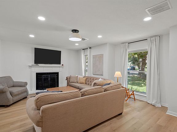 Quietly tucked away in the sought-after Lake Streets of Mountainview, this beautifully updated home blends modern elegance with classic neighborhood charm. Step inside to a light-filled living area where updated windows and new high-end plank flooring set an inviting tone. A cozy gas fireplace anchors the room—perfect for cooler Texas evenings. The flowing layout connects the living, dining, and kitchen spaces, creating an open, welcoming atmosphere ideal for everyday living or entertaining, with a convenient half bath (attached to primary bath) tucked just off the main living area. The kitchen has been completely transformed with sleek cabinetry, a tasteful backsplash, modern countertops, and a window overlooking the backyard. Both full bathrooms offer timeless finishes, including a spacious walk-in shower and double vanity in the primary suite. The secondary Jack-and-Jill bathroom features a beautiful tiled tub-shower combo and its own double vanity, making it both stylish and highly functional for family or guests. Throughout the home, you’ll find new paint, designer fixtures, and subtle mid-century-modern touches. Each bedroom features fresh luxury vinyl flooring and retro-inspired ceiling fans. A standout feature is the expansive flex room with wet bar and plumbing access—perfect as an entertainment lounge, playroom, office, or future mother-in-law suite. Outside, enjoy a new patio and a private, tree-shaded backyard backing up to a ravine for rare peace and seclusion. A new privacy fence, storage shed, and a roof only four years old add value and convenience. Quiet streets and walkable surroundings make evening strolls a pleasure. Modern updates, thoughtful design, and a prime location—this is Mountainview living at its best. Schedule your showing today!