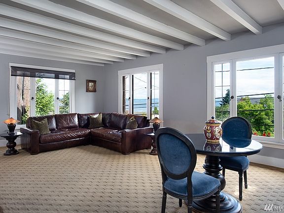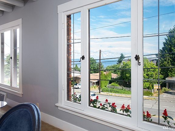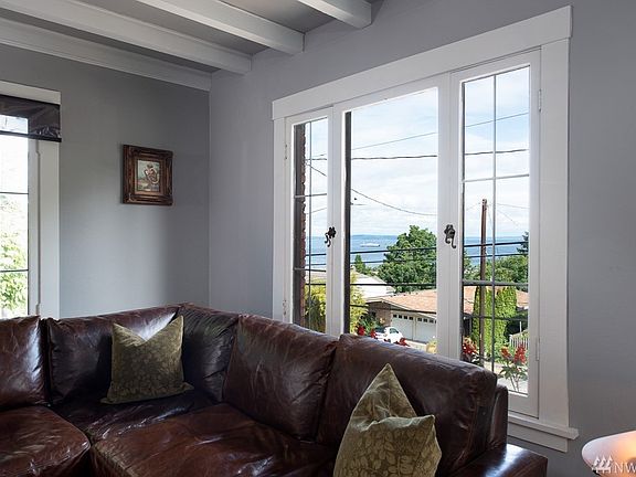 Sound and Mountain Views from this Charming European Craftsman Home. Gorgeous interior w/rich hardwood & slate floors, curved wrought iron staircase, leaded glass windows, arched doorways & high beamed ceilings. Enormous living room & formal dining room w/ornate crown molding. Large high ceiling partially finished basement w/outside entrance perfect for future expansion. Amazing outside entertainment area w/brick patio & fireplace. Walk to Alki.