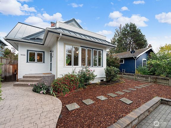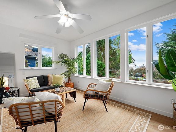 Delightful Craftsman style home in the heart of the Seaview neighborhood.Enchanting sun room entry with French doors and peek views, open living/dining room with tall ceilings, big windows, hardwoods, great entertaining space. Updated kitchen has Viking range, butcher block countertop & plenty of cabinets. Mudroom leads to spacious deck in private, fenced back yard. Main level den or 4th bedroom with 3/4 bath & sliders to deck, a great guest suite! Freshly carpeted upstairs has 3 bedrooms including primary with private deck & sweet Sound views. Full bath serves this level. Unfinished basement is utility, laundry & storage. Gas heat & hot water. Garage currently used as climbing gym/shop could be converted. Wonderful location & neighborhood!